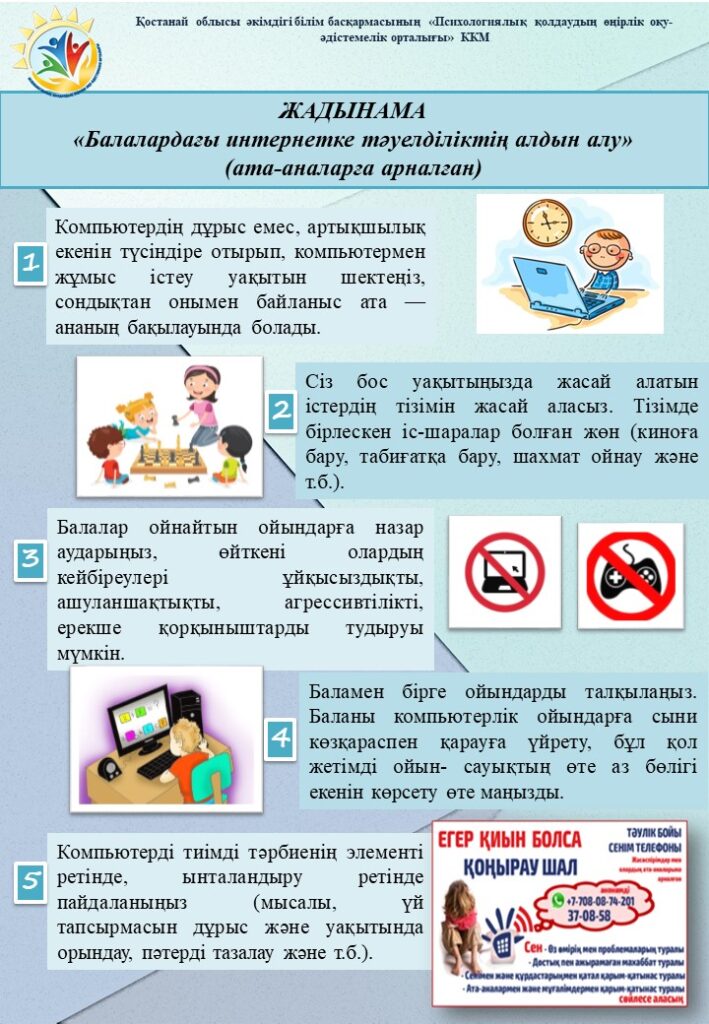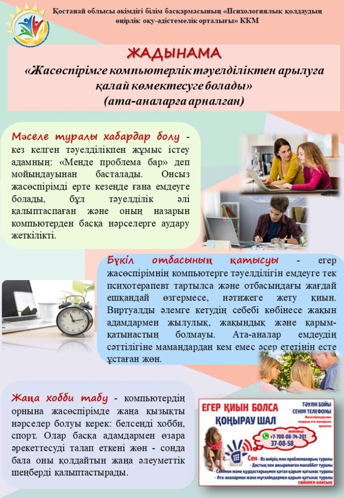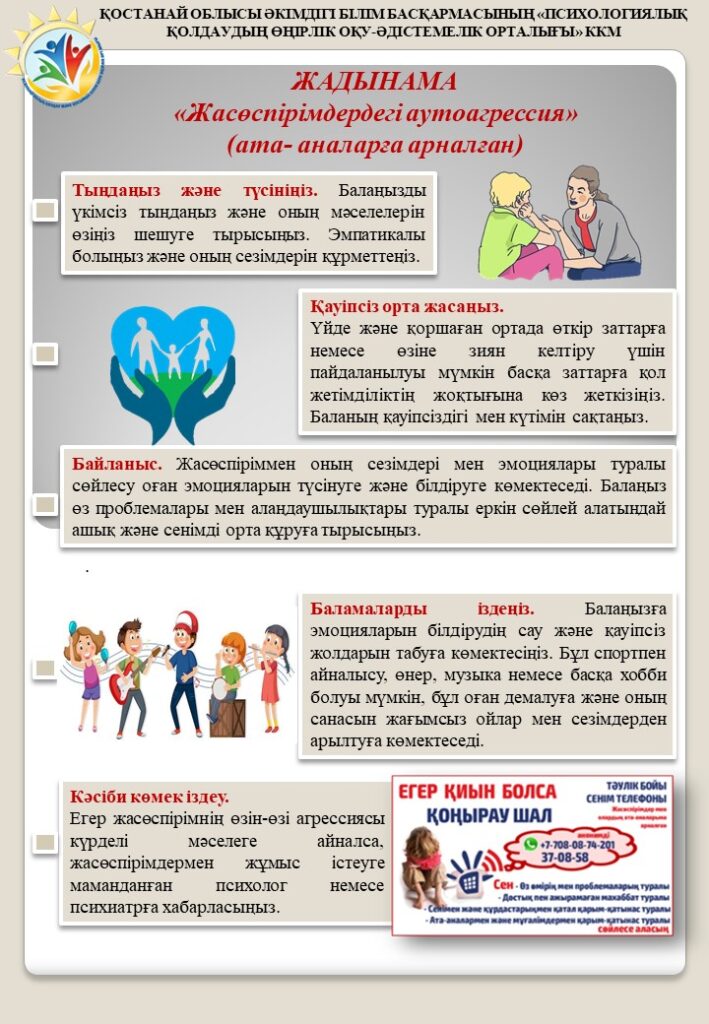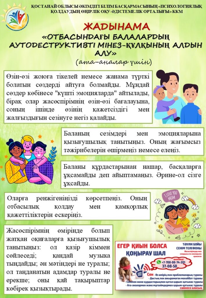 Салауатты өмір салты ЗОЖ алдын алу жоспары Нашақорлықтың, ПБЗ, вапингтің алдын алу жөніндегі жоспар Жасөспірімдердегі аутоагрессия Жасөспірімге компьютерлік тәуелділіктен арылуға қалай көмектесуге болады Балалардағы Интернетке тәуелділіктің алдын алу Отбасындағы балалардың аутодеструктивті мінез-құлқының алдын алу ЖЫНЫСТЫҚ ТӘРБИЕ